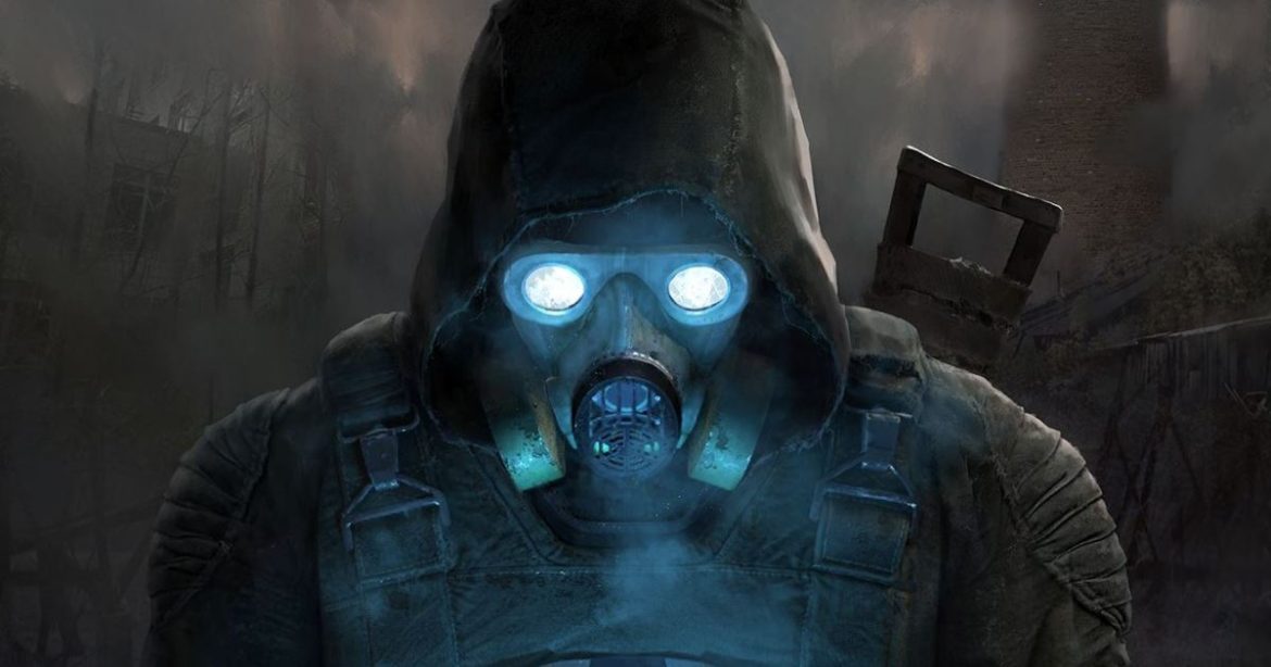 Key art for Stalker 2. A character in a lit-up gas mask and a gun on their back.